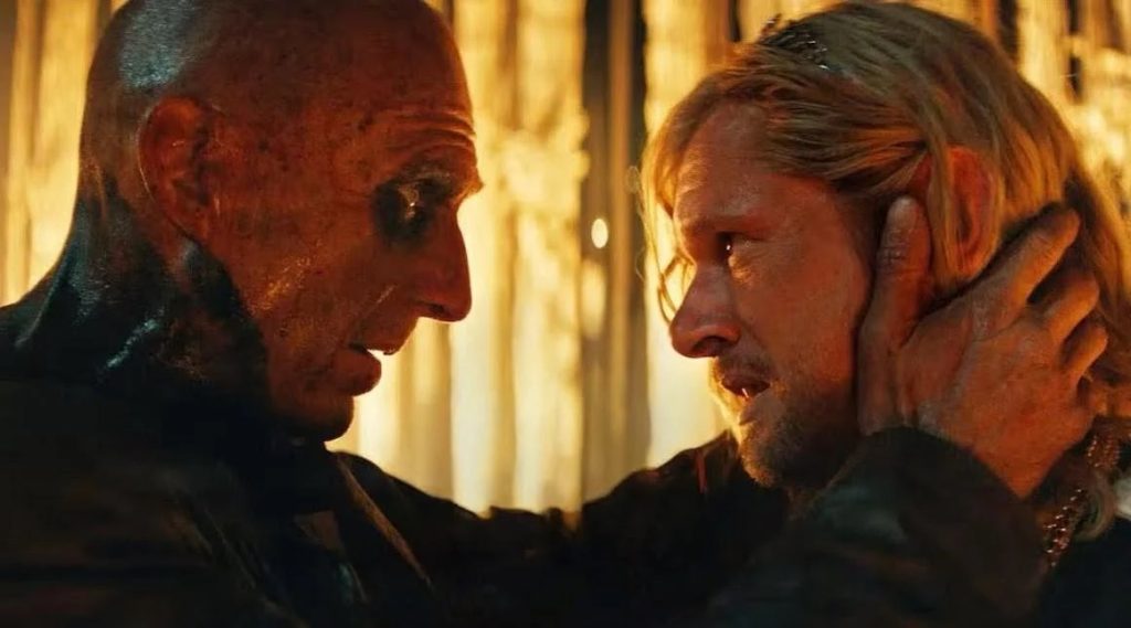 Frente a él emerge Sir Lord Jimmy Crystal, interpretado por un Jack O’Connell en estado de gracia. O’Connell ofrece otra actuación magistralmente escalofriante, elevando cada escena en la que aparece. Su enfrentamiento con Fiennes es visceral, un duelo entre dos fuerzas que se reconocen y se repelen, dos formas opuestas —pero igualmente peligrosas— de reorganizar el mundo tras el apocalipsis. Lord Jimmy no es un villano convencional: es un líder carismático, un predicador del caos que ha construido toda una teología psicópata para justificar la violencia. O’Connell entiende exactamente lo que exige un personaje tan complejo y esencialmente malvado, y nunca lo reduce a una caricatura. Su lógica interna es tan sólida que resulta aterradora.